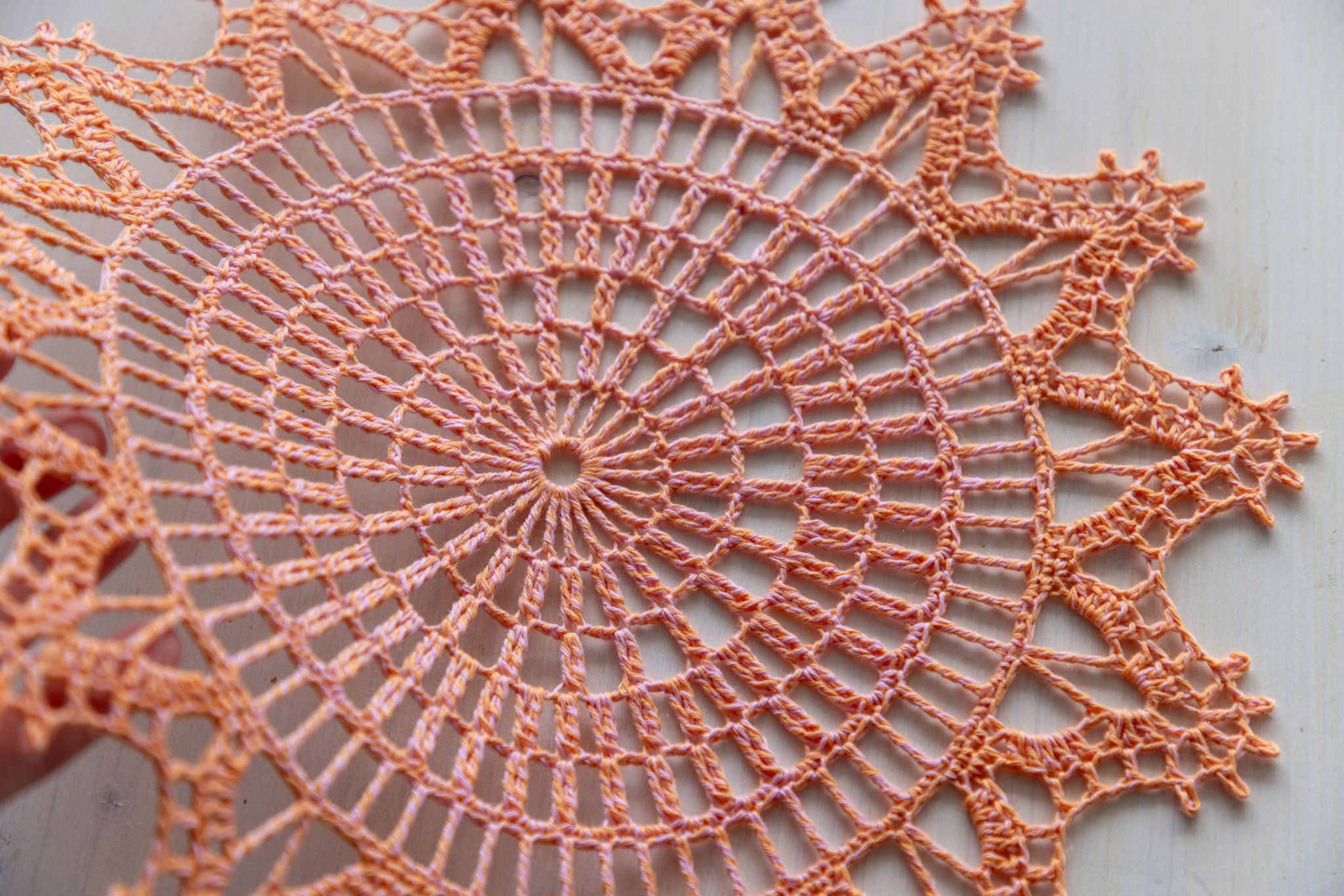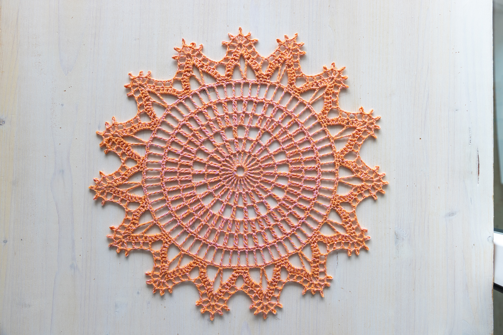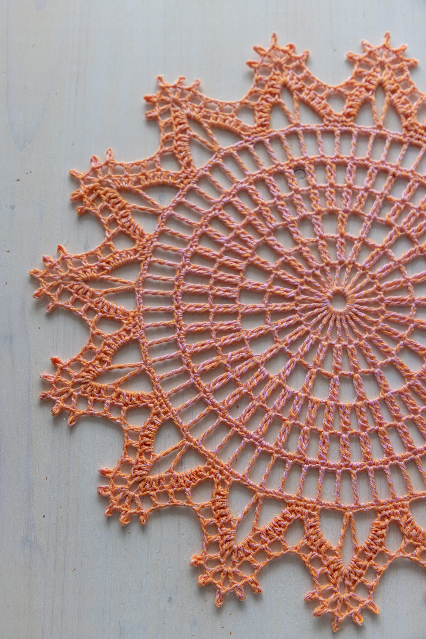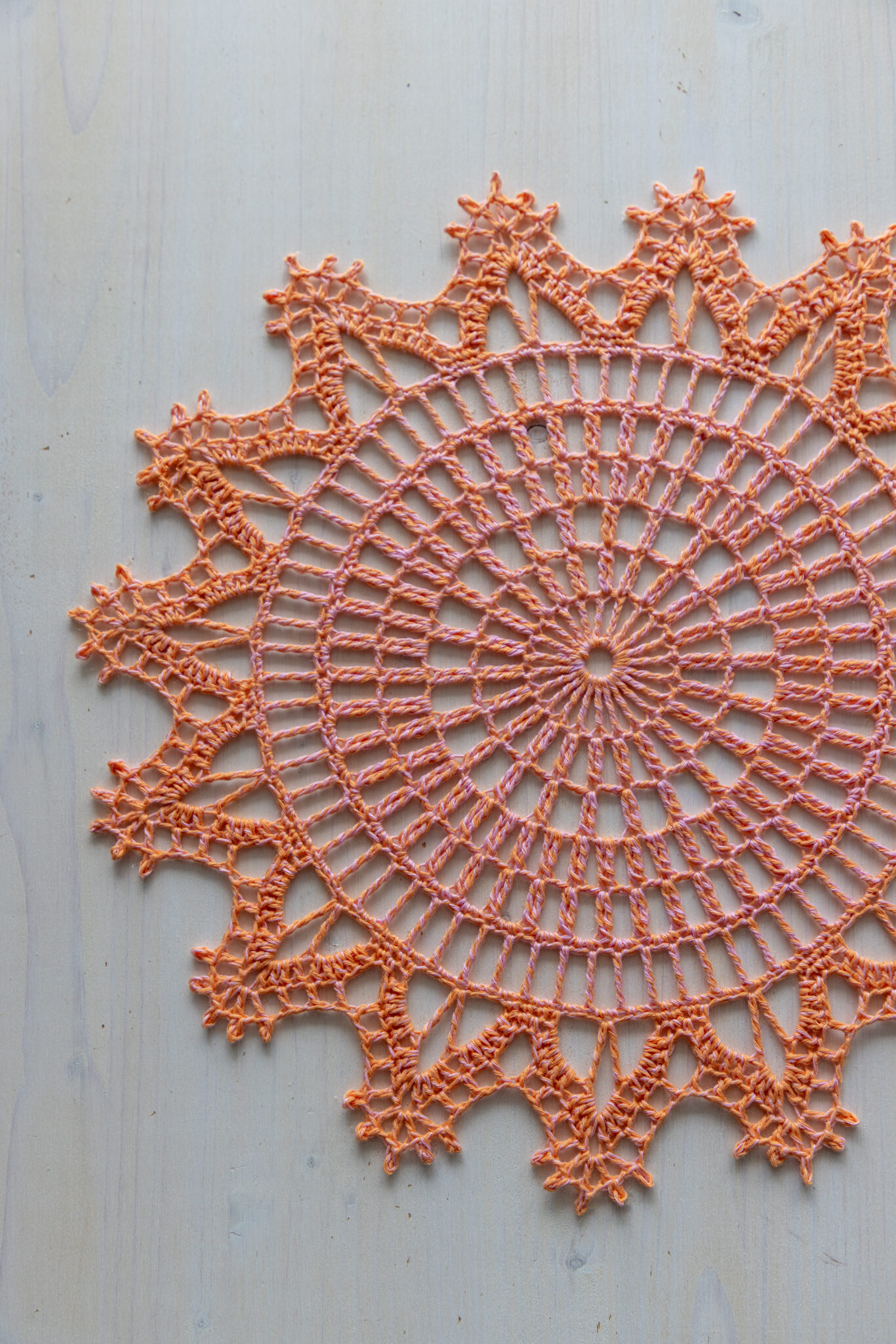 Orange and pink crochet doily, 36 cm