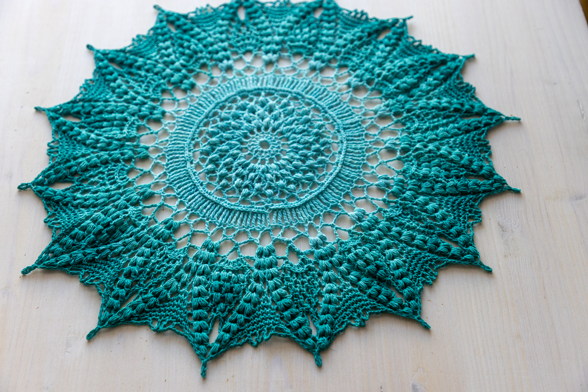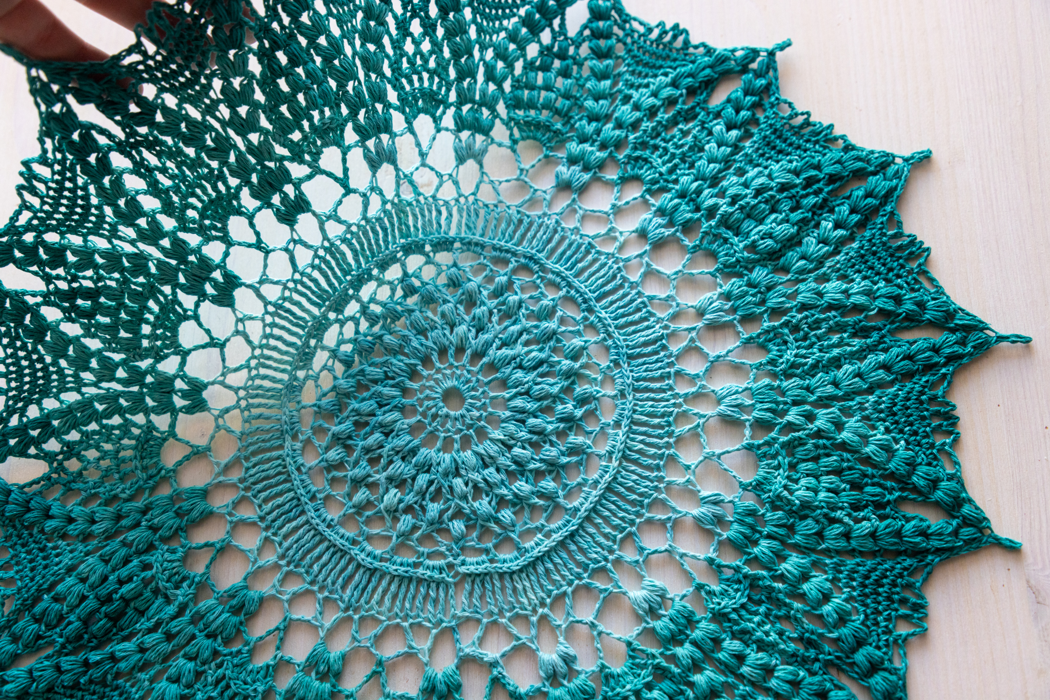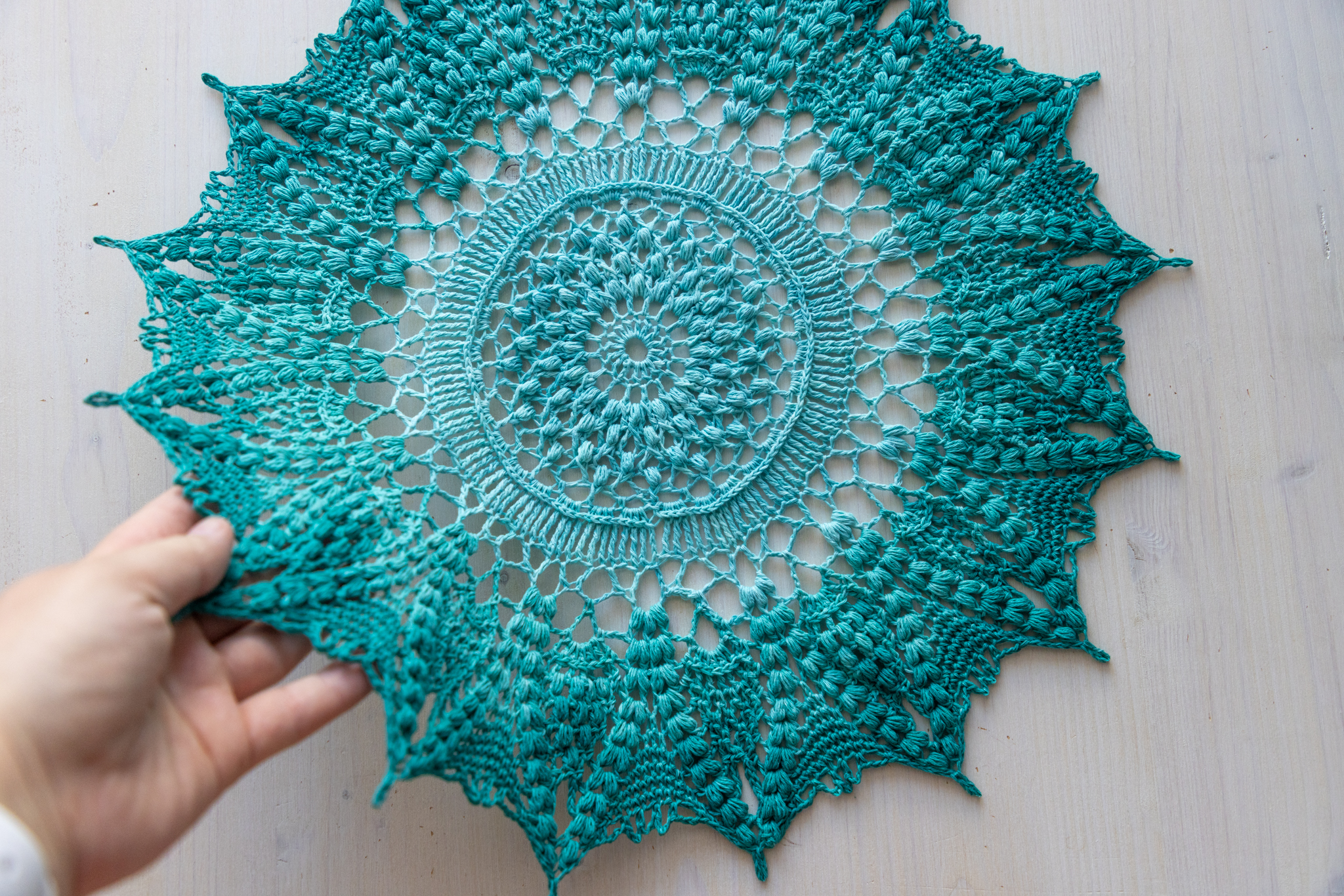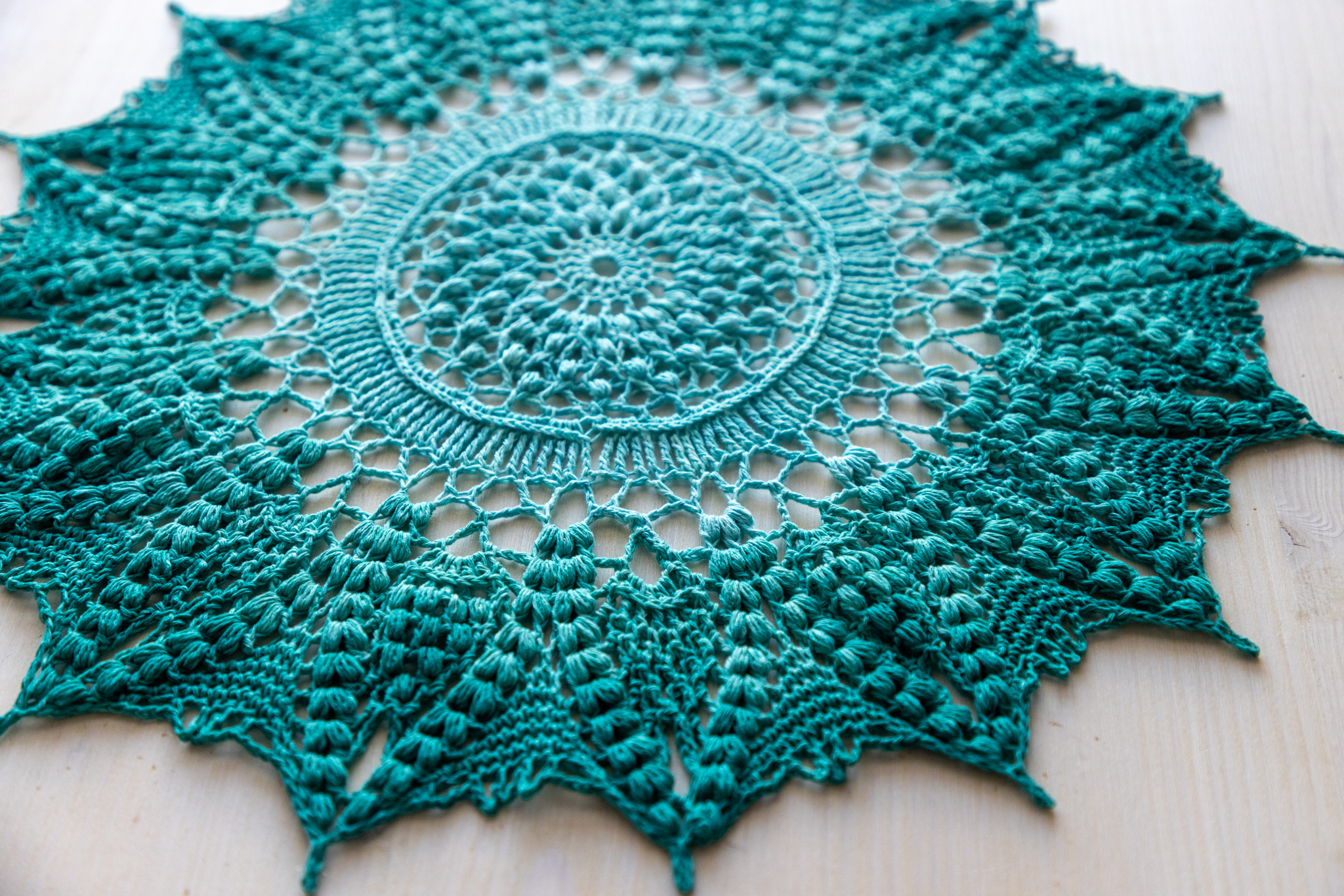 For that doily you’ll need size 3 crochet thread (about 500 m), crochet hook (2.25 mm). Size of the finished doily is about 42 cm after blocking. Please note: during the process the doily can look a bit curly, that’s why I highly recommend to wash and block the finished doily. That process makes the doily flat 🙂 Please feel free to contact me with any questions!